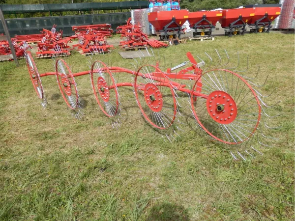 Данный агрегат не нужно соединять с ВОМ трактора. В рабочем положении его колеса опираются изогнутыми «лучами» на поверхность поля, и естественным образом приводятся во вращение во время движения трактора. В контакте с поверхностью поля одновременно находится 4-5 лучей каждого из пяти колес. В зависимости от выставленного положения агрегата, вращаясь, они ворошат и переворачивают зеленую массу, либо собирают её в валки. Несмотря на простую конструкцию, механизм работает с травой практически без пропусков.