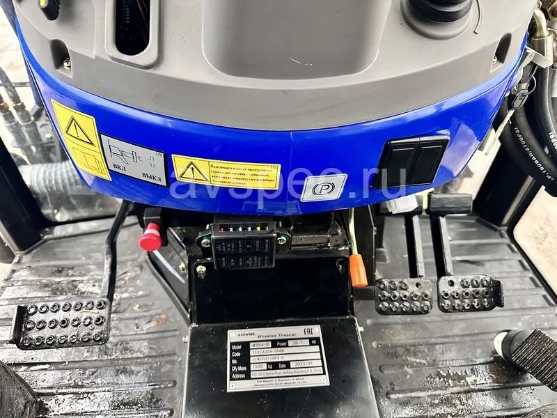 Панорамные окна трактора обеспечивают для водителя широкий обзор. Дизельный двигатель в 35 л.с. имеет жидкостное охлаждение, низкий расход топлива гарантируют несколько часов беспрерывной работы. Для лучшей проходимости на Lovol te 354 спереди установлен балласт из 8-ми блоков весом 9 кг каждый.